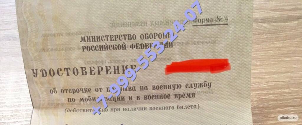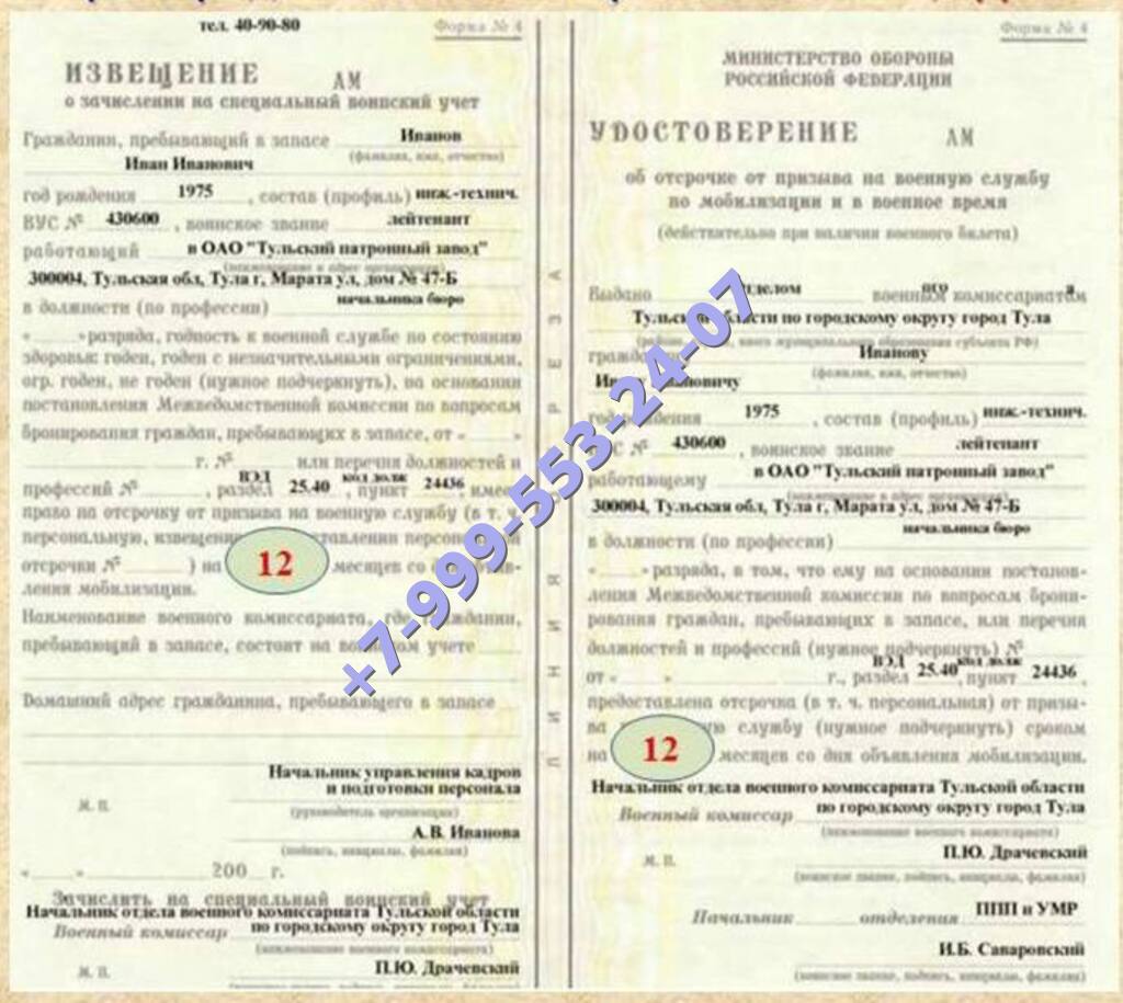 Наша компания предлагает купить в России удостоверение об отсрочке на военную службу на максимально выгодных условиях для клиента. Документы легальные, использованы бланки государственного образца.